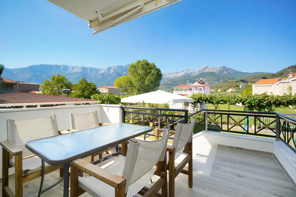 This recently renovated apartment offers one double bed and two single beds, a comfortable living area, and a fully equipped kitchen. It also features a furnished balcony with charming views of the surrounding area. Located on the elevated ground floor, it provides an added sense of privacy and tranquility.